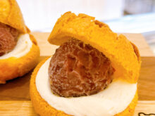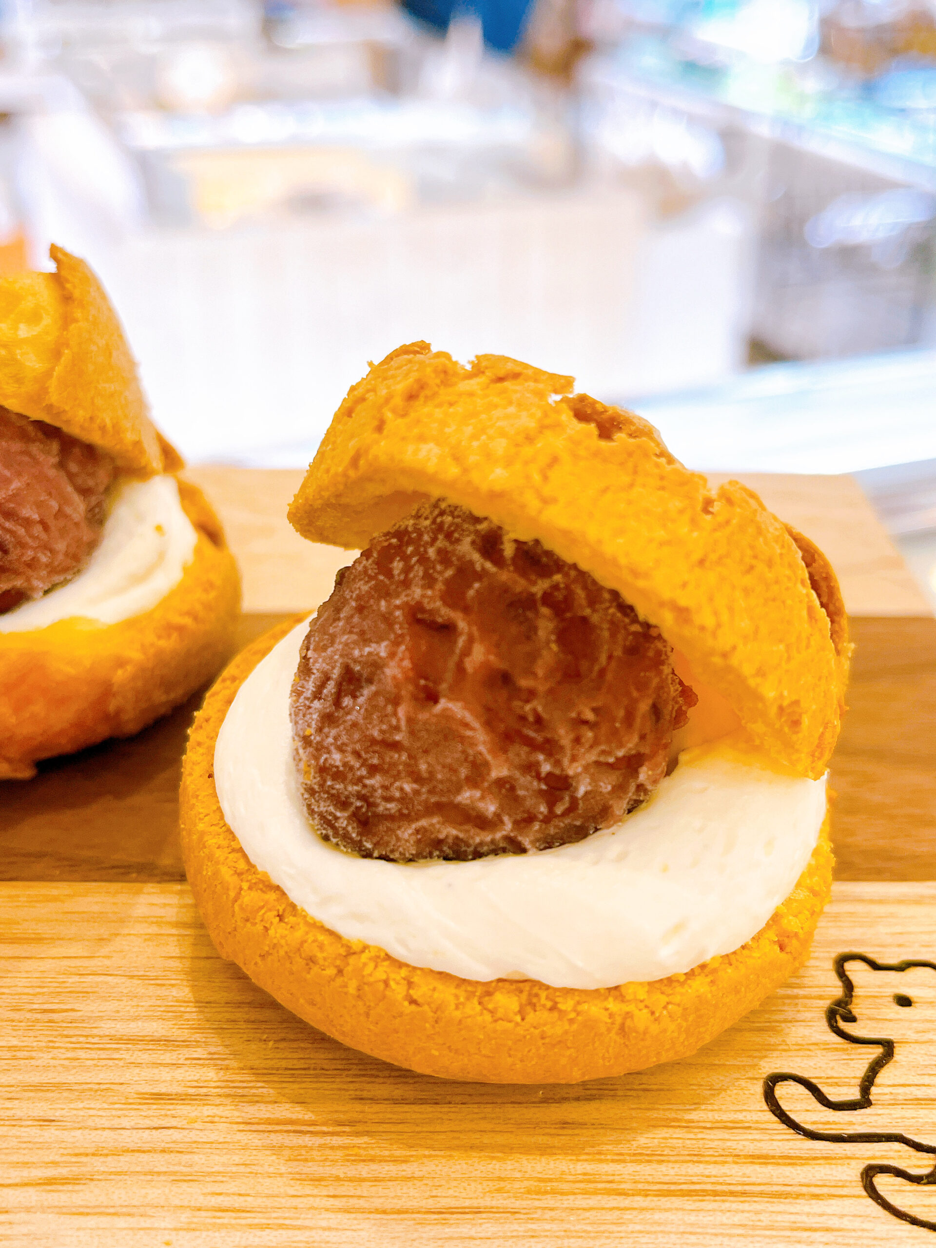 モチモチした食感が特徴的なシュークリームにバニラカスタードクリームと北海道産の小豆を使用したあんこを閉じ込めた あんもっち。 ちょっぴり和テイストをプラスしたすいーつです!! もう一品は北海道産素材にこだわったミニチーズスフレの ふわっフゥ!!